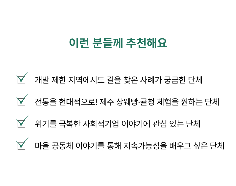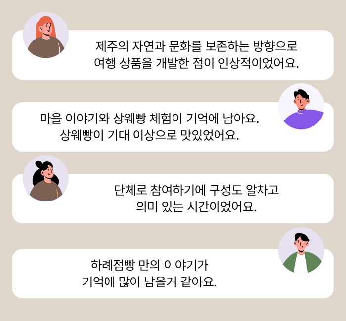 강금순 대표는 개발 제한으로 활기를 잃어가던 하례리에서 마을 여성들과 함께 협동조합을 세워, 전통 상웨빵을 현대적으로 재해석했어요. 상웨빵은 마을 일자리와 사랑방의 역할을 하며, 코로나 위기 속에서도 주민과 소비자의 응원으로 다시 도약할 수 있었습니다. 이번 서라운드트립에서는 하례점빵의 이야기를 통해 생태관광지 하례리에서, 마을과 관광이 연결되는 과정을 하례점빵의 이야기를 만나실 수 있습니다.