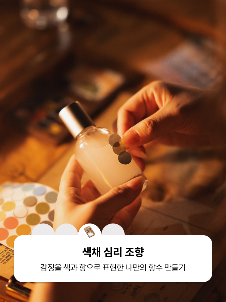 향을 잘 몰라도 괜찮아요. 저희는 여러분이 밤의 목장에서 느낀 감각과 감정(청량함, 평온함 등)을 색과 그림으로 번역 (시각화)하도록 안내합니다. MOOLSSIN만의 독점적인 색채심리조향 과정을 통해, 추상적인 감각이 눈에 보이는 향기 오브제로 탄생합니다.