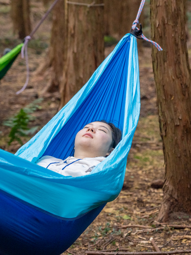 물, 차, 커피 등 자극이 다른 음료를 맛보며 미각을 열고, 해먹에 편히 누워 바람의 결을 느끼며 촉각을 깨우고, 싱잉볼의 울림에 집중하며 마음을 가라앉혀 봐요. 이완될수록 심박수도 서서히 안정되는 걸 확인하는 재미가 있어요.