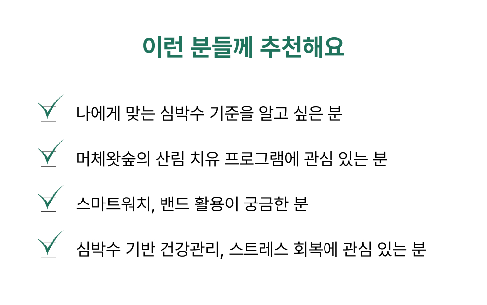 숲에 한 걸음 들어가며 기본 심박수를 먼저 확인하고, 걷는 속도를 천천히·보통·조금 빠르게로 바꿔보며 몸이 어떻게 반응하는지 직접 느껴봅니다. 자연스럽게 “아, 내 몸은 이럴 때 이렇게 반응하는구나” 하고 감이 오기 시작해요.