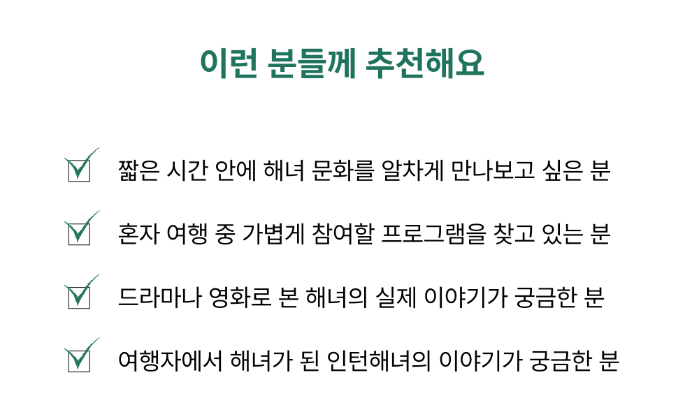 해녀는 어떻게 되는 건지, 제주살이는 실제로 어떤지— 궁금한 건 뭐든 물어봐 주세요! 오늘의 여행벗이 언젠가 인턴해녀와 함께 바다에 들어가는 '물벗'이 될지도 모르죠. 삼춘들이 건네준 이야기들을 소중히 품고, 이제는 여행자 여러분에게 그 이야기 보따리를 풀어드려요.