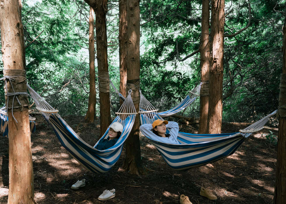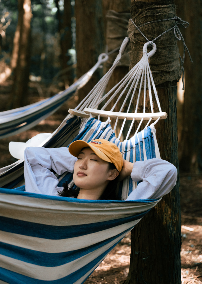 누워만 있어도 좋은 시간. 숲 그늘 아래 해먹에 몸을 맡기고 조용히 쉬어가요. 아무것도 하지 않아도 괜찮은 여유로운 시간을 마음껏 누려보세요.
