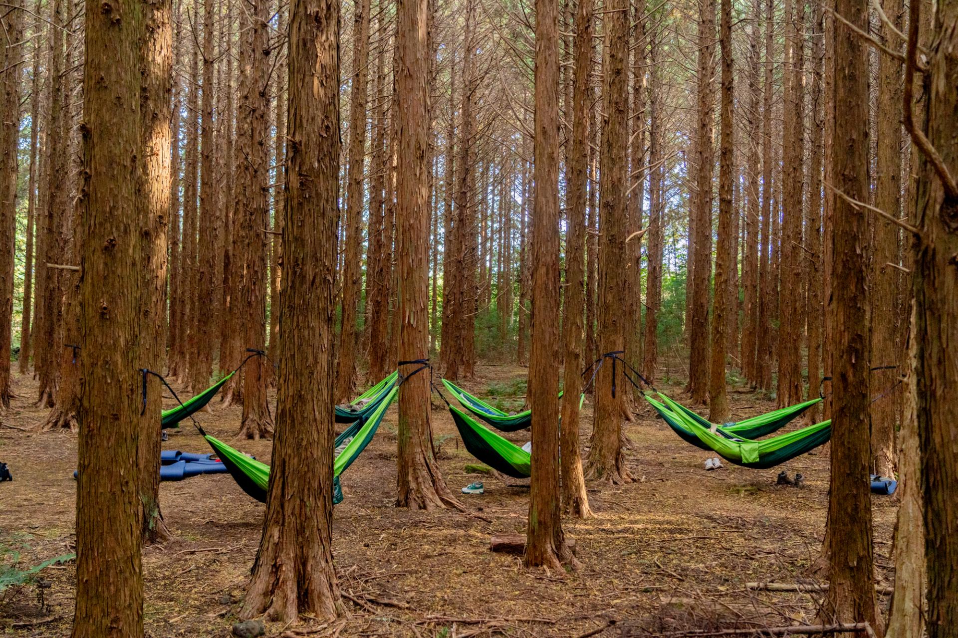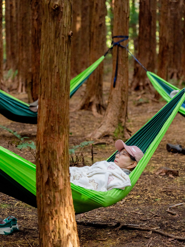 이어 해먹에 몸을 맡기고 흔들림을 느끼며 누워 있으면, 마치 숲이 나를 안아주는 듯해요. 깊은 이완을 온몸으로 느껴봅니다.
