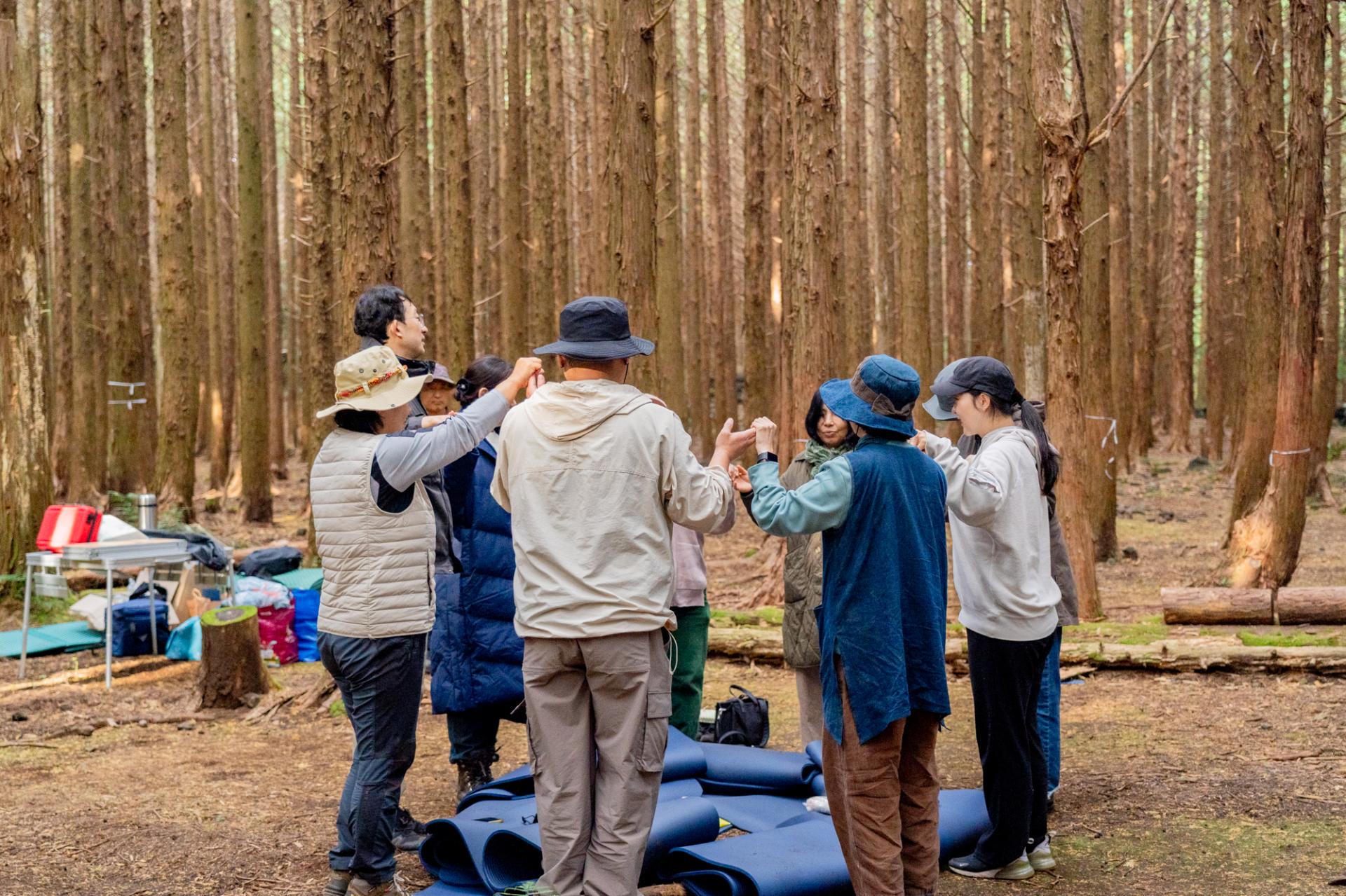 머체왓 숲과 오늘 걷게 될 코스를 간단히 소개받아요. 가벼운 스트레칭으로 몸을 천천히 풀어주고, 숲 속 여정을 시작합니다.