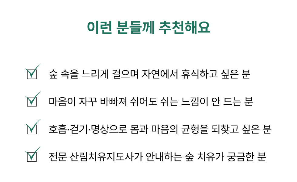 “숲에서 여행자들이 오감과 마음을 천천히 열어갈 수 있도록 안내하는 산림치유지도사입니다.”