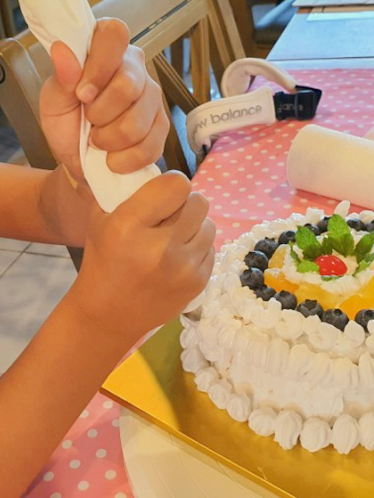 준비된 케이크 시트에 생크림을 바르고 블루베리와 준비된 과일로 나만의 케이크로 만들어보세요. 그림을 그리거나 전하고 싶은 마음을 담아 케이크 상자를 꾸밀 수 있어요. 여행 중 생일이나 기념일이라면 특별한 파티를 해도 좋아요!