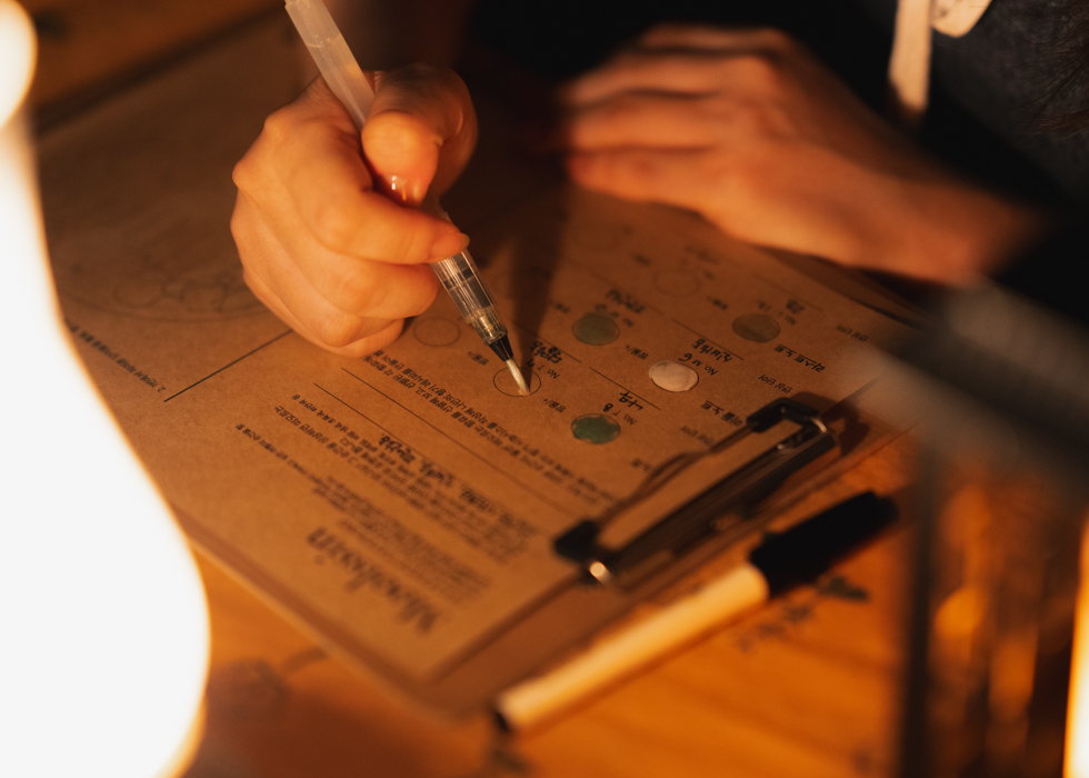 향을 잘 몰라도 괜찮아요. 저희는 여러분이 밤의 목장에서 느낀 감각과 감정(청량함, 평온함 등)을 색과 그림으로 번역 (시각화)하도록 안내합니다. MOOLSSIN만의 독점적인 색채심리조향 과정을 통해, 추상적인 감각이 눈에 보이는 향기 오브제로 탄생합니다.